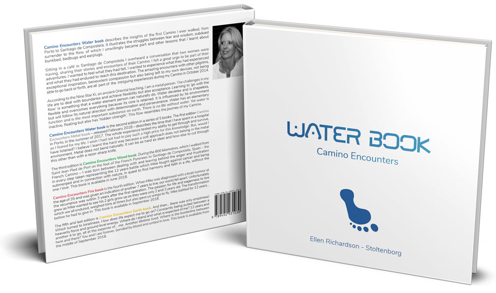 Volgens de Nine Star Ki, een oude Oosterse leer, ben ik een metaal type. De uitdagingen in mijn leven zijn het leren omgaan met mijn eigen grenzen en leren accepteren en flexibel te zijn. Meegaan met de stroom is een natuurlijke eigenschap van een water type. Water vormt zich, maar is ook vormloos en flexibel en overwint alles, omdat de kern behouden blijft. Het wordt beïnvloed door zijn omgeving, maar zal zijn natuurlijke richting blijven volgen met vastberadenheid en doorzettingsvermogen. Water heeft een elementaire functie en is de belangrijkste stof op aarde. Er is geen leven zonder water. En hoewel water inactief is, heeft het ook een ‘verborgen kracht’. Deze krachtige stroming is de weerspiegeling van mijn eerste Camino.
